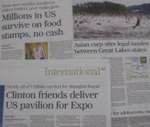 Flicking through the South China Morning Post’s international section this morning, I am delighted to find no fewer than three opportunities to re-read whole, hefty-sized articles that I perused in detail yesterday in the New York Times on-line. They are ‘Clinton friends deliver US pavilion for Expo’, ‘Millions in US survive on food stamps, no cash’ and (I wasn’t busy) ‘Asian carp stirs legal tussles between Great Lakes states’. Not only that, but I also have the excitement of these three hitherto unseen headlines, which were crafted from scratch by the SCMP’s sub-editors as original works to fit their own publication’s layout. As it happens, one enjoyment of each story was enough, but it is thoughtful of them to give us the choice.