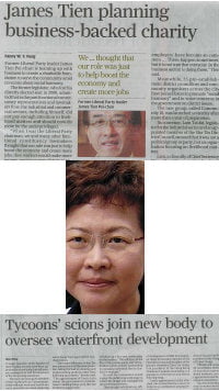 A seat on a sensitive advisory committee whose work will be watched by every environmentalist, heritage freak and post-80s radical is a double-edged sword. A pat on the head, perhaps, but also a recipe for extreme public opprobrium if you are caught showing any sympathy to a property company, having any truck with an inch of reclamation or touching a single hair on some baby dolphin’s head. As popular discontent swells, and our feudal business elite’s date with the noose draws nearer, these tycoon-kids are being thrown in the deep end. The local traditional business community that they will one day inherit needs to be rehabilitated, and it will take more than a frivolous Victorian-style James Tien charity for the ragged poor.