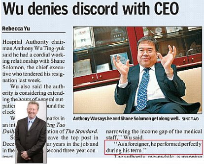 In today’s Standard, the Bauhinia Foundation/General Chamber boss laments the departure of Shane Solomon, chief executive of the Hospital Authority, of which Wu finds time to be Chairman. He says: