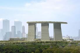 That monstrosity in the picture (any resemblance to Stonehenge purely unintentional) is called Marina Bay, and it is apparently all about seamless connectivity and new lifestyle options. I assume the planners were sitting around, watching the three towers rising from the construction site, and one said, “Hey, do you think they would support a massive concrete banana thing balanced along the top?” And his colleague said, “Yeah, you mean something that looks not merely ill-proportioned, unbalanced and misshapen, but just plain vile?” And the third added, “Yeah, with an infinity pool.” And Asia’s ugliest building was born, and Singapore finally became number-one at something.