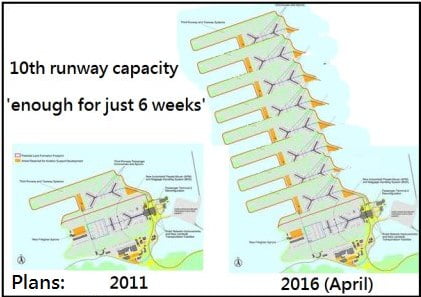 Ah, the clash of NIMBY-pimbys and bureaucratic morons ruining any credibility they previously might have had. Having actually read the whole 3rd runways proposal (a couple hundred pages? http://vps.hongkongairport.com/mp2030/TR_24May_Eng_Full.pdf ), it does look rather daft that it only buys 10~15 years worth of capacity. It’d be a bit like closing Kai Tak and blowing huge amount of money on prostiti… errr, on the new CLK airport and had it run up to capacity limit in 2008. Not so smart.