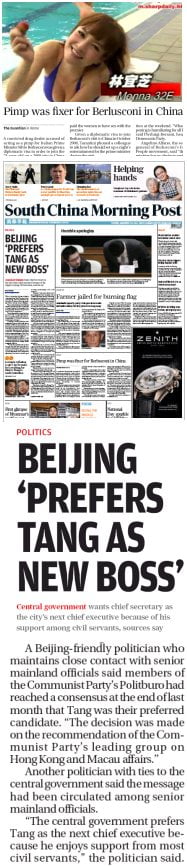 Conspiracy theorists would say that the local media are all ultimately puppets of Beijing. A less alarming way of putting it would be that it is impolite, too close to the bone and image-shattering to openly admit that the Chief Executive election is a sham. It would be like discussing bodily functions. Or we can get really, seriously cynical. The media engage in this silly pretense because they need a story. Otherwise, all they have is ‘Sleazebag caught running Italy’ or ‘Woman with flat but expansive mammary glands seen lounging by swimming pool’.