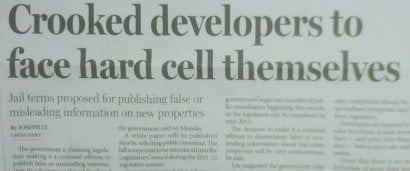 The Hong Kong government raises the possibility of criminalizing theft by false pretenses by property developers. The media are focusing on the proposed penalties, and it is true that the idea of property giants’ directors being hauled off for five years in Stanley Prison has a certain appeal, however fanciful. But the real story is what the resulting law will purport to ban and whether it will succeed.