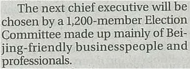 The SCMP’s writers know as well as anyone that the 1,200 members of the Election Committee will have no more say over the choice of the next Chief Executive than the other 7 million of us. The decision is made by Beijing, and the ‘election’ by the 1,200 next March will be a charade. The only thing more embarrassing will be the straight-faced references to it in the media suggesting the sham is real.