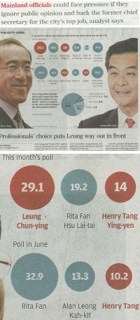 The South China Morning Post asks how easy it will be for Beijing to appoint Henry Tang as Hong Kong’s next Chief Executive in the face of negative public opinion. This follows the poll results it published yesterday giving Henry a pitiful 14% approval rating, compared with a slightly more impressive 29% for Leung Chun-ying. The SCMP article quotes two learned commentators who mildly disagree with each other about how much this will influence the final decision, leaving the reader none the wiser.