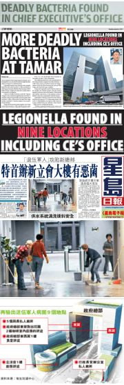 Legionnaire’s Disease has been found not just in Education Secretary Michael Suen’s washroom at the lavish new Government Headquarters in Tamar; it’s in the East Wing, the West Wing, the Legislative Council building sitting symbolically in the shadow of the giant white elephant, and it’s in the boxy little structure opposite. The HK$5 billion complex is riddled with the deadly disease.