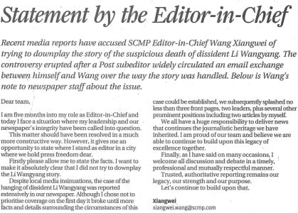 It seems that Wang Xiangwei has not really replied to the journalists’ request: “We hope that you will assure us … we will continue to enjoy a free working environment”.