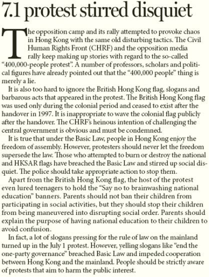 A Wen Wei Po editorial approvingly adds that ExCo meeting hours will be longer and states that the body was ‘passive’ in the last few years and “…members were informed only after principal officials finished drafting the bills and policies [so] non-official ExCo members were not able to fulfill their roles [and] put forward amendments and suggestions [and so] a number of policies introduced were not quite people-oriented…” (The following column, reproduced here at the bottom for fun, features an exquisite Communist rant about 7-1 marchers’ use of the British colonial flag and opposition to ‘national education’.)
