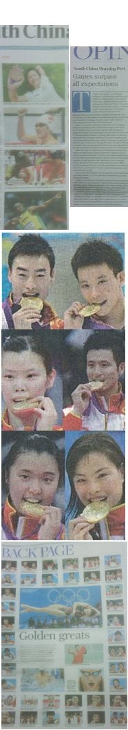 The front-page story emphasizes China’s sportsmen, while the whole back page is dedicated to China’s, and only China’s, gold medal winners – echoing the fetish with coming first that even some Mainlanders in the Daily Beast article are criticizing. “The scale of [the athletes’] endeavour and achievements cannot be denied,” it insists. (And what on earth is it with this medal-biting thing? Come back ‘V’ sign, all is forgiven)