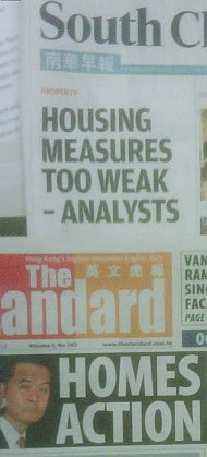 Third is the ‘Hong Kong land for Hong Kong people’ idea – or lack of it. Some purists oppose the concept by bleating about free markets (where all the land is nationalized?) or even a slippery slope leading to capital controls. A more pressing problem would be the danger of appearing to indulge populist anti-locust feeling at a time like this, and increasing anti-Hong Kong sentiment on the other side of the border. There are also supposed to be implementation and legal issues, too, though other jurisdictions manage it OK.