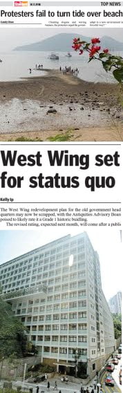 A tie: that’s the outcome judging from page 5 of today’s Standard. Protesters look set to fail in their attempt to preserve Lung Mei, a rocky, no doubt foul-smelling and slimy patch of shoreline crawling with loathsome invertebrate life-forms. This follows a government announcement that it would press ahead with its ‘win-win solution to promote community development’ thing, otherwise known as an artificial beach.