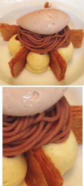 Recovering from the raw yolk-black mucus trauma, I pulled the trusty camera out to capture pudding: ‘Chestnut ice-cream, brown rum marinated raisins & pastry diplomat cream served as a deconstructed mille-feuille’. (Whaddya mean, ‘What’s diplomat cream?’) I was suspicious at first. It was magnificent visually – possibly the finest ever expressionist figurine crafted from dairy products and marron glacé. But where, or rather what, was the challenge? Was there shaved air-dried hedgehog loin scattered into the gaps left by the deconstruction of the mille-feuilles? Did chili-stuffed pickled garlic lurk within the cream as a tantalizing contrast to the soothing sweetness? Had Richard Ekkebus’s minions left delicate shards of specially imported broken glass in every mouthful?
