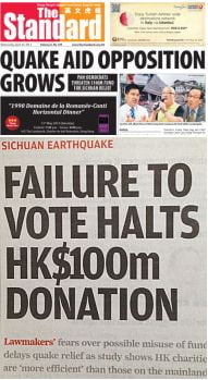 Hong Kong lawmakers oppose quake aid; Hongkongers reject sending aid; Sichuan relief efforts provoke Hong Kong skeptics. The Big Lychee’s response to the Lushan earthquake does not leave the city looking like a shining beacon of generosity.