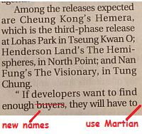 unaffordable, and specifically mentions three projects that, it happens, are noteworthy for the ineptness of their names. The problem is: they are running out of wacky things to call ugly high-rises. What is a hemera? It sounds like some sort of painful, bloody rupture in the abdomen. The homes, by the way, are not to be sniffed at: they’re near a huge landfill. As for The Hemispheres, the two in my brain produce different word-associations: ‘Christopher Columbus’, discoverer of a new one, and ‘boobs’ (or your favourite equivalent – word-associations are actually picture-associations, for me at least). This Henderson Land project is predictably promoted by the Standard, which raves at how the generous discounts will bring a 284-square-foot apartment to below HK$6 million. Small, crumb-eating loser-developer Nan Fung’s ‘Visionary’ might be better value, being in Tung Chung, a place so fun, exciting and convenient to live in that public housing units lie empty.