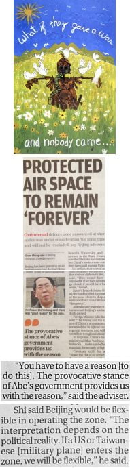Whether it is going to the PLA’s plan is another issue. Professor Shi says “the provocative stance of the Abe government” is the ‘cause’ of the air defence zone. But it could just as easily be the other way round: the Chinese military wanting the zone to ‘cause’ a (yet) more belligerent and militarized Japan, thus a bigger budget and a bigger voice in national affairs for the PLA, or whatever else they have in mind.