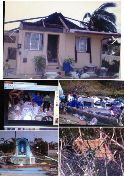 Clockwise, from the top: her house, still standing but minus a roof (a new one is being arranged); their less well-accommodated neighbours’ home, which lost roof plus walls, though the TV survived; the neighbours’ bed; the local church, which also lost walls and roof, leaving just the shrine to the Virgin and the baptismal font; and the family cooking and eating on the floor. This was one of the less badly affected areas.