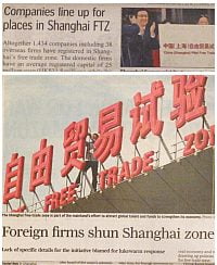 brings to mind the Shanghai Free-Trade Zone, launched a few weeks ago with considerable vague hype but no specifics. The headlines on the right are from today’s Standard (‘Shanghai FTZ cup half-full, virtually overflowing’) and the South China Morning Post (‘Shanghai FTZ cup half-empty, indeed pretty vacant’). Needless to say, the two papers are reporting the same story. The basics are that 1,434 companies have ‘registered’ in the zone, but 97% are Mainland firms; there is no word on why they are registering or what it even means in practice, but we have mumblings that the FTZ ‘looks much like the rest of the country’.