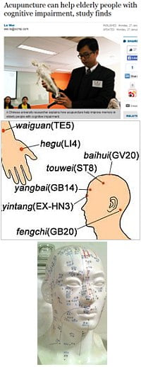 I would have ignored this, except someone’s grabbing my tax dollars, via the Food and Health Bureau’s Health and Medical Research Fund: Chinese University researchers say acupuncture can help elderly people with cognitive impairment.