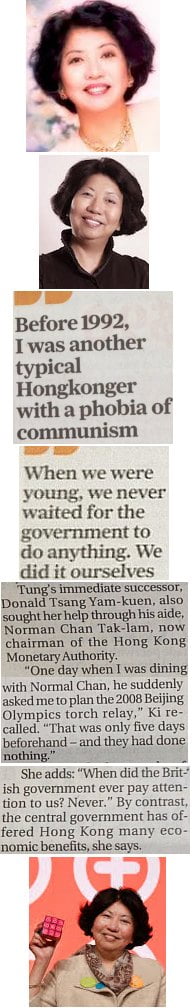 Today’s shoe-shining spectacular is brought to you by the South China Morning Post, in the form of a glowing profile of Leonie Ki Man-fung SBS, JP. As the mere Silver Bauhinia Star indicates, Ki is not in the Hong Kong establishment’s top drawer. If she had inherited a rent-seeking textiles fortune or a property-cartel conglomerate, or if she had been born and raised within the devout Communist untouchable caste of colonial times, she would have made Gold by now. That’s meritocracy.