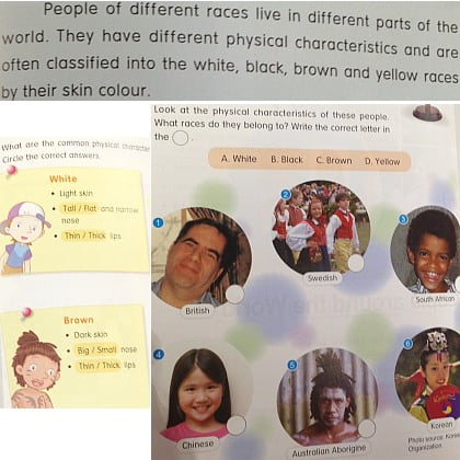 Obviously, this whole saga is about unconscious racism and textbook authors whose ignorance is truly cringe-making. The ‘I can list the customs of different races’ is bizarre, conjuring up visions of Blacks’ innate sense of rhythm, the inscrutability of the Yellow man and the way Brown/White people smell funny because they eat curry/cheese. (No place for Redskins in the Big Lychee, it seems.) The continuous theme of four races named by skin colour and the subliminal association of darker skin with backwardness or inferiority is similarly jaw-dropping – these ideas were last openly embraced in polite society by Victorian Westerners seeking a Darwinian, scientific justification for racial (and broader social and economic) supremacist policies.