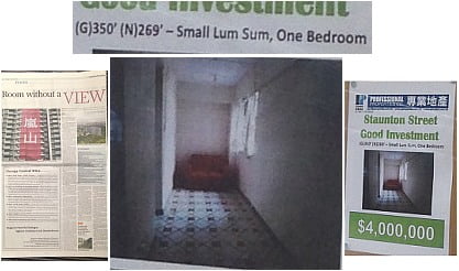 It has a grand 269 square feet of actual space, which includes ‘One Bedroom’ (which is one more than you would expect, I suppose). You can’t get mortgages for old places like this in Soho, so the selling point is that it’s yours for a mere HK$4 million in cash. It looks like a Detroit crack den, or some last-resort hovel for a family in Gaza – or the setting of some sick slasher film. For a few thousand bucks, the seller could have given it a lick of paint and switched a light on – but they haven’t even bothered to do that. Mont Vert suddenly makes sense: homes are so tiny and miserable, it’s an act of mercy not to let you look at them.