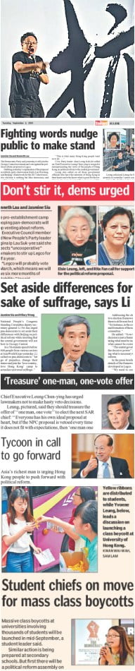 The pro-dems are possibly better off looking at the big picture. One argument is that if we accept this quasi-democracy, we will be stuck with it for good. Only rejection might shock Beijing into seeing sense. But will this convince public opinion any more than it will convince Xi Jinping? Appeals to principle are certainly impressive. Bowing to totalitarianism is morally wrong; rejection of the proposal will be a blow to the Communist regime. The overseas press will love it. But will local people – the ones who aren’t in Scholarism – see it as noble or naïve? They’re the ones that need to be convinced.