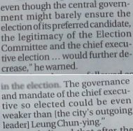 He is worrying that overly zealous manipulation of the process could harm Hong Kong people’s trust in the 1,200-strong zombie-packed Election Committee, and leave Carrie weaker as CE than outgoing CY Leung. This is the guy who thinks the Hong Kong courts are wrong to convict cops of beating prisoners, so of course he could be wildly wrong, and she will be a dazzling success.