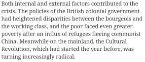 However, there are bigger reasons to sweep 1967 under the carpet. Hong Kong workers in the mid-60s had legitimate, compelling reasons to fight for better conditions. But activists with Mainland connections were sucked into Mao’s Cultural Revolution insanity. In essence, they started setting off lethal bombs in Hong Kong for fear that Red Guard fanatics across the border would denounce them – maybe kill them – for not doing so.