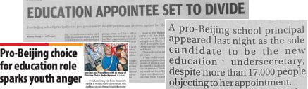 But then along comes news that Carrie will be appointing pro-Beijing loyalist Christine Choi as the Deputy Vice Sub-Assistant Under-Flunky at the Education Bureau. Choi is unabashedly pro-‘National Education’, also known as ‘Letting Communists Brainwash Our Little Kids’. One highly believable theory is that the Liaison Office wanted Choi to take the top Education Secretary role, and giving her the number-two position is the compromise.
