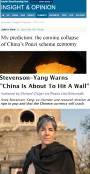 The whole global system might look precarious. But in particular, the coming collapse of China’s bubble Ponzi-scheme economy continues to come. The South China Morning Post’s Jake Van Der Kamp cites ever-expanding steel production and predicts that when the crash happens it will take the Communist Party with it, leading to something along the lines of post-USSR Russia. Anne Stevenson-Yang, looking at the property market, foresees a sharp fall in the Yuan and eventual recovery on a more sustainable basis – including a happy ending for Vitasoy.