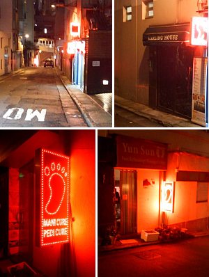 Neighbourhood update: A rare mid-evening Sunday stroll reveals a very different side to the usual weekday daylight local backstreets. Cheap garish (red) electric signs outside little ground-level businesses (curtains in the doorways?!) dominate the gloom. I’m sure this peculiar foot-massage thing is 100% above-board and wholesome. But if you want Sleazy Bangkok Ambiance for a photo-shoot, just down from genteel Robinson Road is the place to come (or something)…