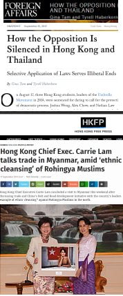 This will spill over onto the international stage. Take this unfortunate juxtaposition: Foreign Affairs lumps Hong Kong with army-ruled Thailand as regimes that abuse the law to silence pro-democrats; and Chief Executive Carrie Lam visits Burma in mid-ethnic cleansing to push ‘Belt and Road’.