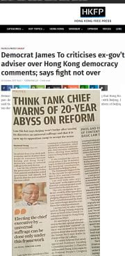 A slightly nostalgic Old Hong Kong moment, as veteran mild-mannered pan-democrat James To and veteran mild-mannered pro-Beijing apologist Lau Siu-kai discuss the prospects for political reform in an atmosphere of mutual respect. Back in the days before politically driven prosecutions, purges of lawmakers and plans to brainwash schoolkids, this sort of thing was quite normal.