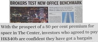The South China Morning Post reports that people who paid HK$40 billion for Hong Kong’s fifth-tallest office tower, The Center, think they got a bargain. Brokers who agree are suddenly oozing around, drooling at the prospect of the new owners flipping their acquisition at a 50% profit. The logic is that the buyers paid HK$33,000 per square foot, while Henderson Land stumped up the equivalent of HK$50,000 psf for a roughly comparable downtown site. The earlier deal set a ‘benchmark’ – so, obviously, the HK$33,000 valuation is a massive giveaway.