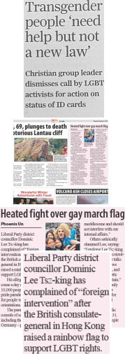 The fundamentalist Christian/fundamentally gruesome Truth and Light Society repeated its opposition to legal recognition of transgender people’s adopted gender, now accepted in many (notably Western) countries. And a pro-establishment Liberal Party local politician freaked out over a foreign plot to force gay marriage onto Hong Kong after the British consulate flew a rainbow flag. (The Standard’s layout people wittily-perhaps put the story on a pink background.)