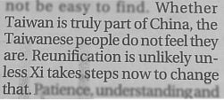 The South China Morning Post goes somewhat off-message as a (venerable and worthy) commentator gently points out that China has pretty much lost Taiwan. The author tries to be nice about it, and comfort Beijing with the idea that perhaps it could still re-jig the Leninist mouth-frothing and ranting in such a way as to appeal to Taiwan’s free and democratic people. Reading between the lines, it’s clear he doubts it.
