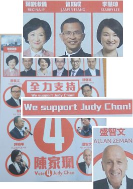 In Hong Kong Island, the United Front picked Regina’s New People’s Party candidate Judy Chan to represent the pro-Beijing camp. This makes sense: the NPP has a ‘middle-class’ image, and Judy has (arguably/theoretically/approximately) some sort of young-glam-girl-next-door thing, as befits the prosperous neighbourhood. The more overtly pro-Communist DAB/FTU are running suitably doltish stooges in the Kowloon/New Territories races.