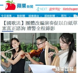 Enjoy it while you can: a rather fetching jazzed-up version of March of the Volunteers, which could be illegal under the forthcoming National Anthem (Sincere Veneration (Compulsory)) Ordinance. The report says plain-clothes cops were videoing this performance, and you have to ask: is the government seriously going to prosecute people for this?