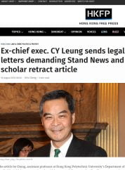The Communist Party-idolizing half-Transylvanian has spared time from his anti-separatism and other crusades to instruct his lawyer to send a snotty letter to Stand News for publishing “unfounded allegations that a close relationship existed between Mr Leung and the triad society or the underworld”. (That’s obviously a typo – should be ‘afterworld’.)