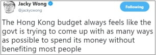 Even by mentioning the Hong Kong Budget you run the risk of taking it seriously. To criticize it with a straight face, as the whole spectrum of politicians, media and commentators must, is to play along with what is a farcical annual ritual. (We won’t even talk about glowing praise/analysis – pass the barf bag.)