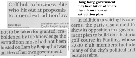 The SCMP goes off on a rather bizarre tangent, claiming that the local business community are criticizing the extradition proposals as protest/revenge for the Hong Kong government’s moves to use part of their precious golf course for housing.