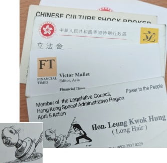As his last day approaches, the Company Gwailo continues to clean out the orifice. I’ve filled up a huge (now immovable) box of books for disposal before the Illicit Publications Police come snooping. And there’s the inevitable stack of old business cards. Some will be donated to the HK Museum of Evil Radical Troublemakers…