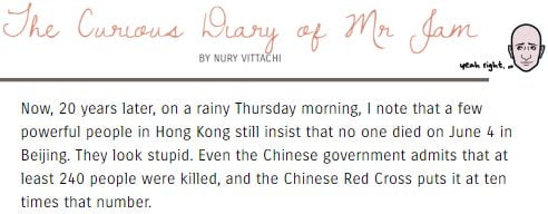 Incidentally, UK activist Benedict Rogers introduces a group dedicated to helping Hongkongers going into exile. This attracts a churlish name-check in today’s drivel from Nury Vittachi. The columnist wasn’t always so embarrassingly pro-Beijing. An alert correspondent spotted the following comments in the celebrated humorist’s then-column of June 4, 2009 – the 20th anniversary of the Beijing massacre…