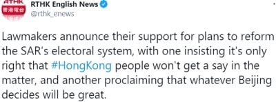 Note that Xia Baolong includes the judiciary among those who run Hong Kong – which is not new, but you wish they’d stop saying it. Bottom line: if judges wish to keep their ‘independence’, they’d better start doing what they’re told. He also states that anyone who does not accept the CCP cannot qualify as a patriot. What this guarantees – if it’s any consolation – is that those still sitting on councils and committees will be entertainingly stupid.