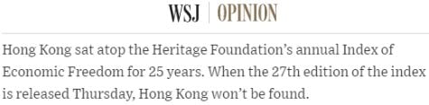 Nor exactly coincidentally, Hong Kong is ejected from the Heritage Foundation’s Economic Freedom Index, on the grounds that the city no longer enjoys autonomy and is run directly by Beijing. (Taiwan ranks at number 7.)