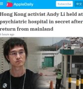 And it gets grimmer. Although Andy Li is still missing, you might think the most sinister dictatorship-persecuting-dissident scenarios are too grotesque to imagine – they wouldn’t chuck him out of a helicopter or put him in a mental hospital, surely. Except Apple Daily says authorities have indeed put him in a secure unit at Siu Lam Psychiatric Centre ‘to prevent him from “speaking out of turn” and revealing details about his treatment in mainland China’.